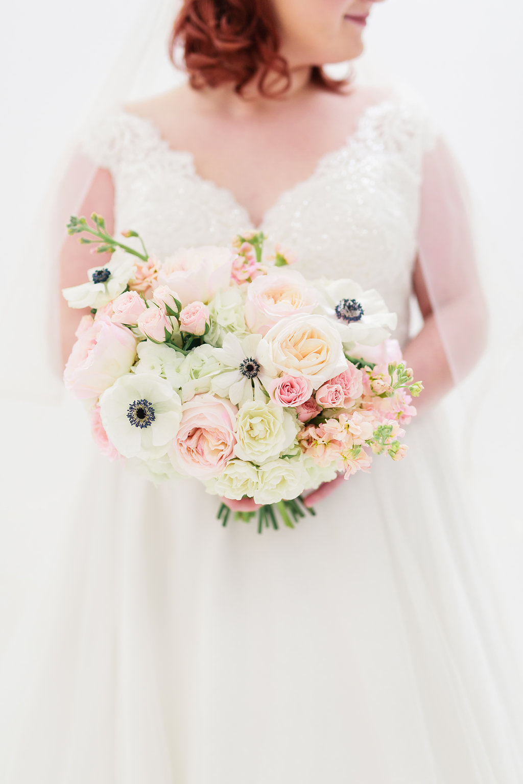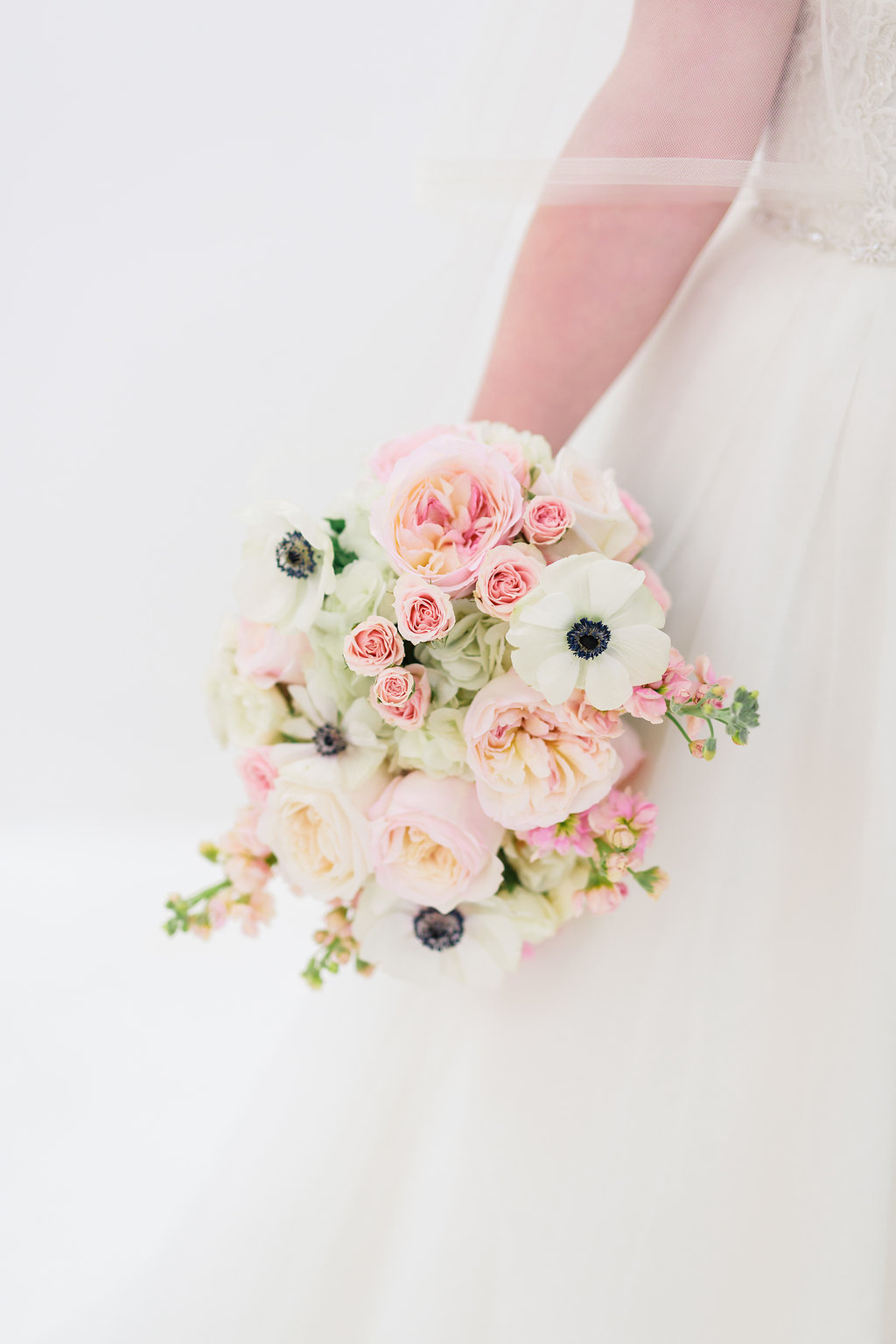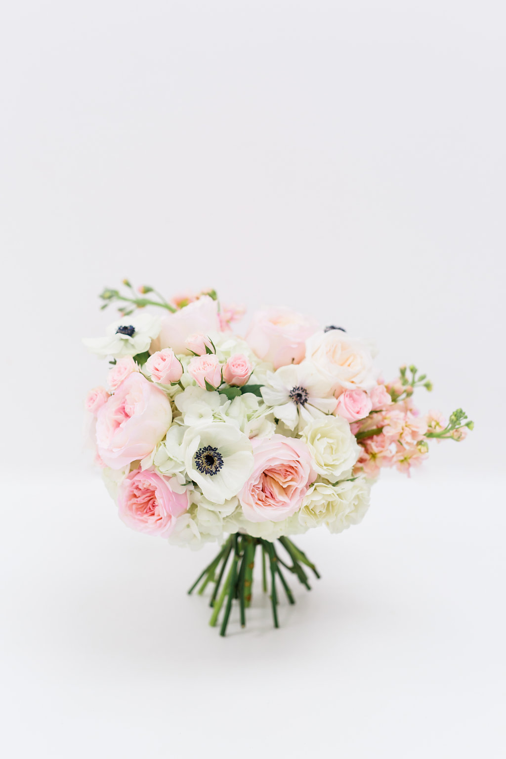 Stunning blooms in, blush, cream, ivory & white with bold anemones for a dark navy tone with small hints of soft greenery.